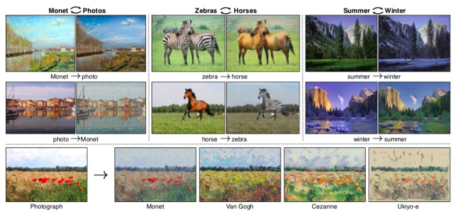 CycleGAN于2017年被提出,可执行图像翻译任务。一旦经过训练,你就可以将图像从一个场景转换到另一个场景。例如,通过马和斑马数据集训练后,如果你给它一个地面上有马的图像,CycleGAN可以将马转换成斑马。