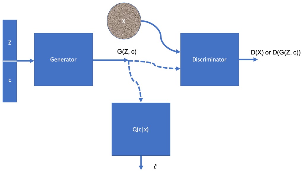 InfoGAN中的生成器接受两个输入:潜在空间Z和潜在代码c,因此生成器的输出是G(Z,c)。训练GAN,使其最大化潜在代码c和生成的图像G(Z,c)之间的互信息。下图显示了InfoGAN的体系结构:
