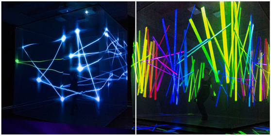 但ETEREshop的3D投影立方体的核心特点是,由于使用了先进的投影和运动捕捉技术,并结合VR控制器,所有效果都可以由表演人员实时操作。两个运动控制器将实时跟踪和捕捉演员的肢体动作,并触发投影3D效果的即时精确响应。