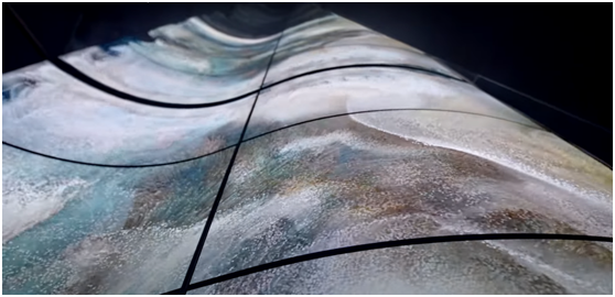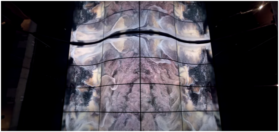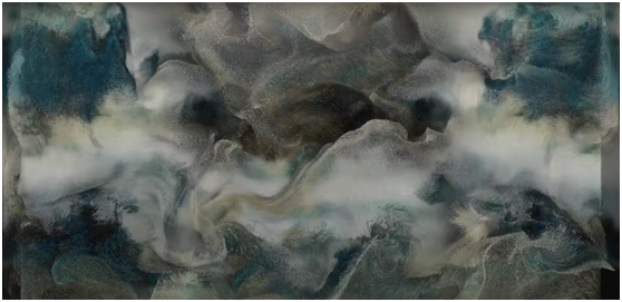 在这部8k的影像中,使用人工智能风格的深度学习算法,从互联网上创作的数千幅东方写意水墨画中学习数万个像素数据点。然后,一个人工智能机器人被编程为自动绘制多种变化的风景画,从而在一个屏幕上绘制出一幅大型抽象视觉作品,描绘粒子的流动和变化。