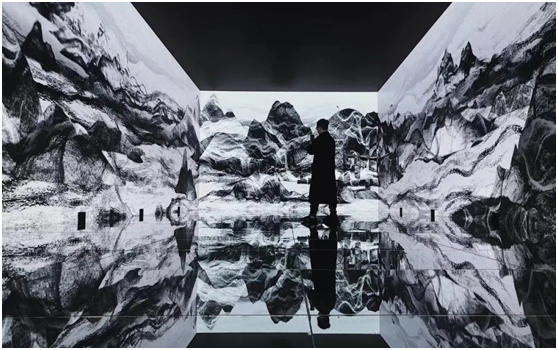 《人工智能山水图》使用人工智能算法,借助以往山水画艺术品生成的不断变化的新媒体山水画,模糊了物理世界和虚拟世界之间的界限。