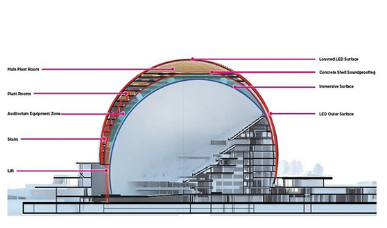 此外,外部屏幕还能够用于显示球体内正在进行的演出活动的直播。