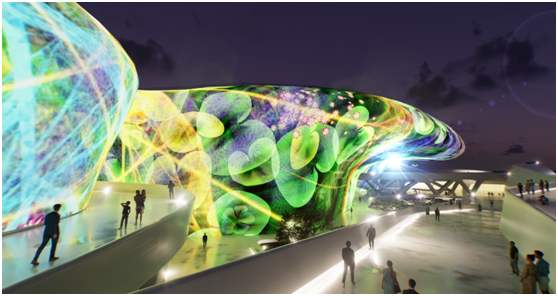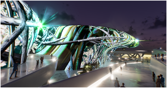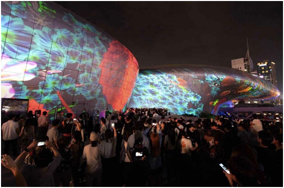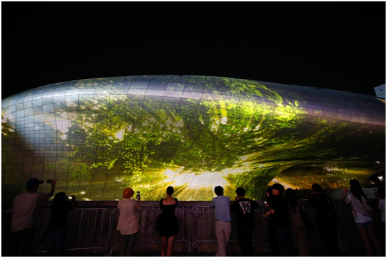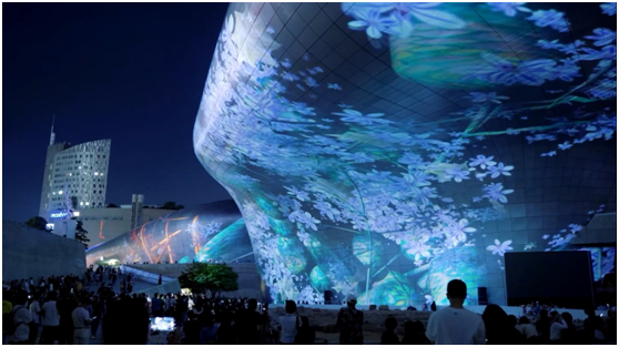 米格尔•施瓦利埃“利用东大门设计广场外墙的222米超大型建筑曲线外墙为画布,通过投影3D MAPPING技术进行艺术内容展示,此次作品名为《Meta-Nature AI》。