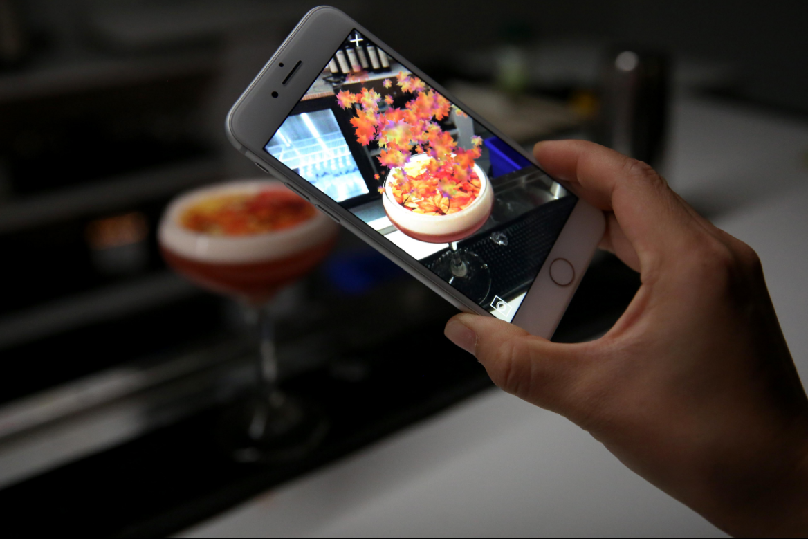 通过应用商店和google play上提供的免费AR移动应用程序可以呈现饮料增强现实效果,它可以用于名为“秋季的精神”的一款鸡尾酒。把你的手机摄像头对准饮料表面,就可以一边看着枫叶图案在你的杯子周围起舞一边品味这个由茶、柠檬草、木槿、酸橙调制的,有着秋天味道的调制酒精饮料。