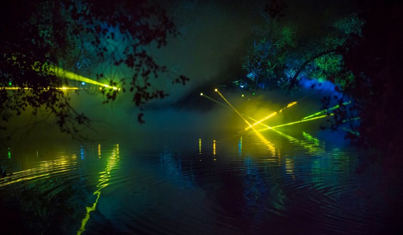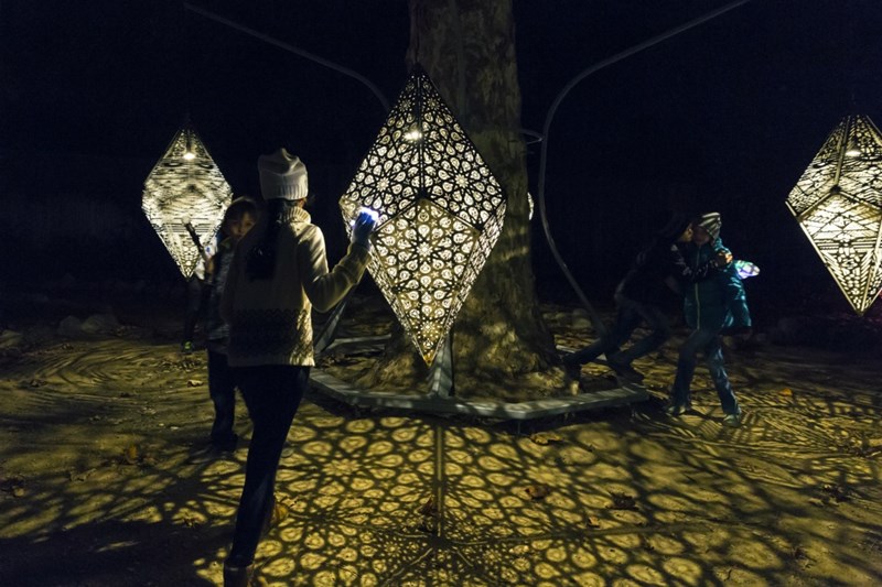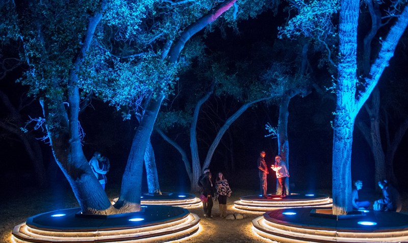 公园里有很多高大的橡树,他们有300-500年的历史了,白天他们郁郁葱葱,到了晚上,它们被灯光所渲染,随着光色的变化,呈现出不断变换的气质。它是一个互动装置,客人不仅可以控制灯光,还可以控制橡树林中的音乐。