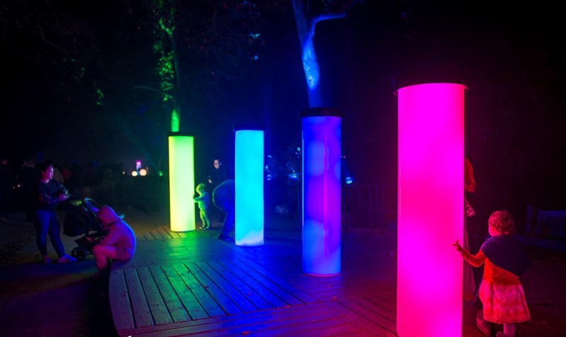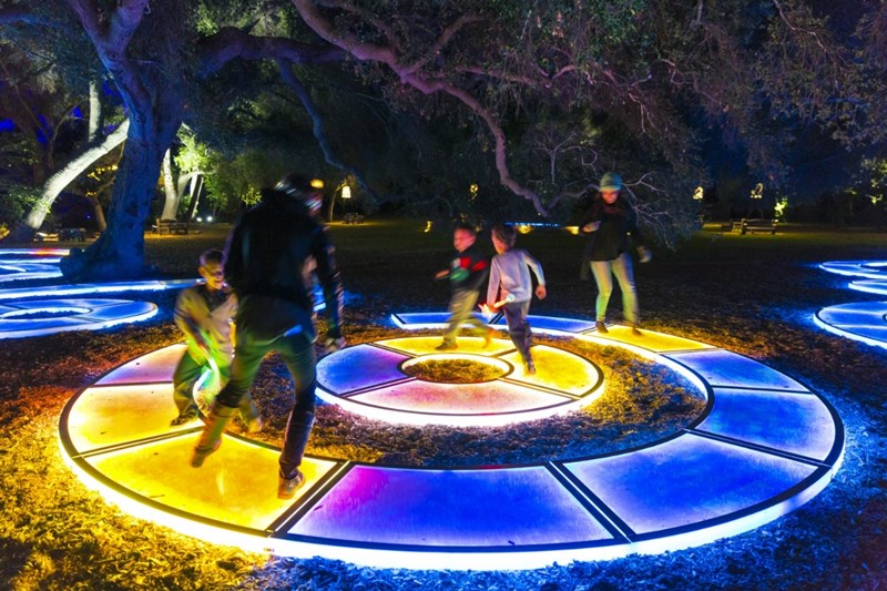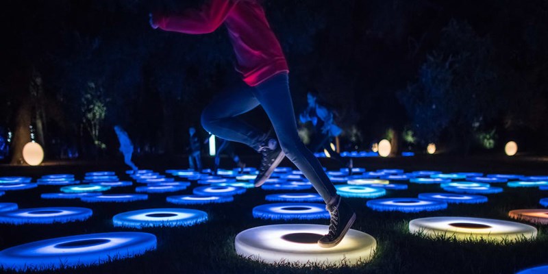 of light可以说是一个很酷的互动灯光艺术展览,适合家庭、情侣和孩子们游玩,它的大部分装置和作品都能够随着你的触动,变换出绚丽的效果,总共10个不同体验的区域或者说装置被安置在公园内,你可以不断在其中游走,感受着光色的魅力。
