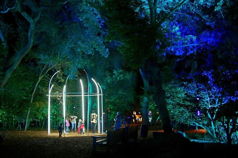 梦幻森林和随橡树交响曲类似,是另一个更短暂的、几乎是空白的游览空间。一系列细长的、半拱形的光带标志着穿过著名的山茶花植物的通道。这个区域在这个植物园的历史中占有重要的地位,但梦幻森林区本身最终成为一个大型自拍区,因为扩散LED的均匀、干净的白色提供了充足的照明,这些反向发光的“曲棍球棒”的排列形成了有趣的形状。