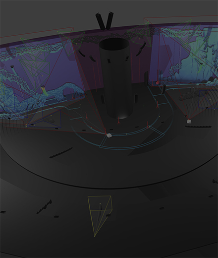 通过点云技术剧场建模,追踪摄像机和投影系统标定校准,借助水下光学标记点的使用,完成了灯光、投影机、舞台机械等声光电设备的集成。22台32000流明的barco激光光源投影机,配合1300平方米的LED大屏,为演出的剧情推进和氛围烘托起到了关键作用。