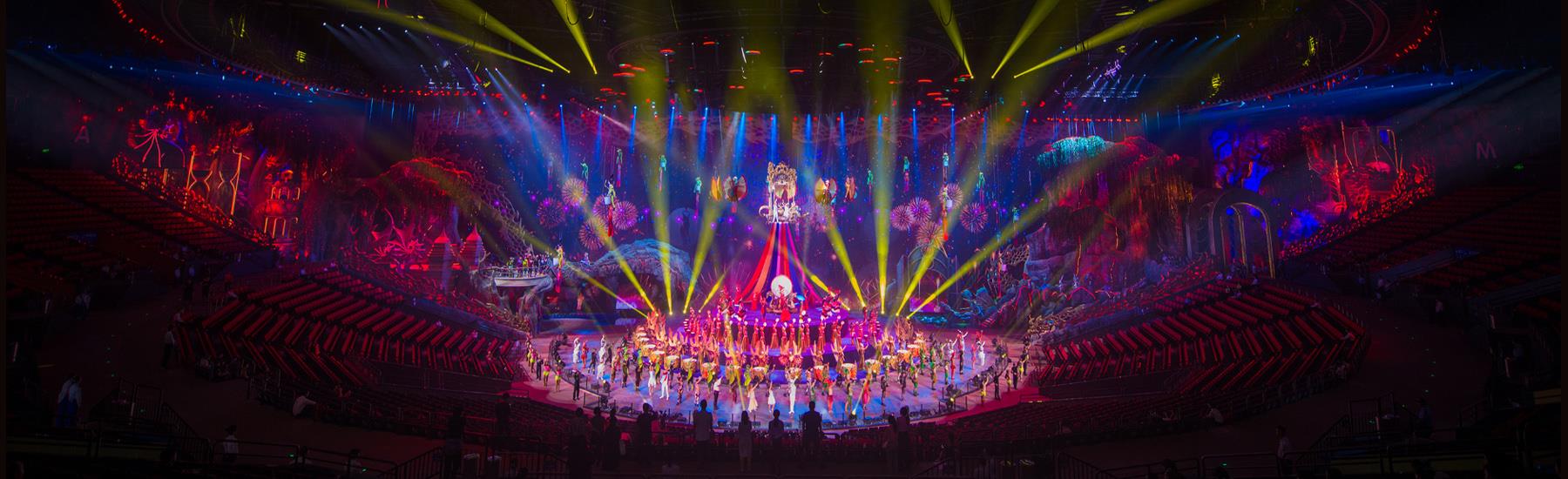 珠海长隆剧院总建筑面积达7.1万平方米,剧院把LED特效与高亮度投影系统有机结合,将极致的舞美、灯光、音响等元素重新定义整合,连接紧凑剧情氛围,大大加深了观众的沉浸感。270°全景式环形舞台和3大环绕水道、空中飞行轨道及隐藏式飞行器等大型演艺设备,以及水上花船、双层水帘、升降喷泉等水陆空效果随不同节目灵活变换,带来“上天入地下水”的不同演出效果。